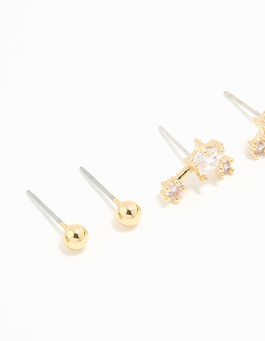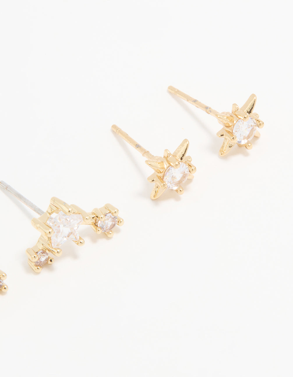 Stack up your style with this Waterproof Gold Plated Stainless Steel Celestial Stacker Earrings Pack! This dreamy trio features delicate ball studs, sparkling cubic zirconia star trio studs, and chic cubic zirconia star studs. Crafted from durable stainless steel with a gold-plated finish, these stud earrings are perfect for adding a celestial vibe to any outfit. Whether you're dressing up for a night out or keeping it casual, these versatile earrings are ideal for mixing, matching, or layering. Pair them with anything from denim jackets to flowy dresses for effortless charm. Plus, they're waterproof, so you can shine bright wherever life takes you!