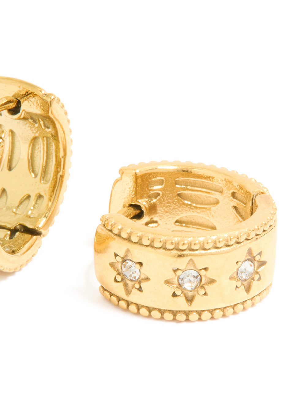 Waterproof Gold Plated Stainless Steel Cubic Zirconia Celestial Etched Hoop Earrings