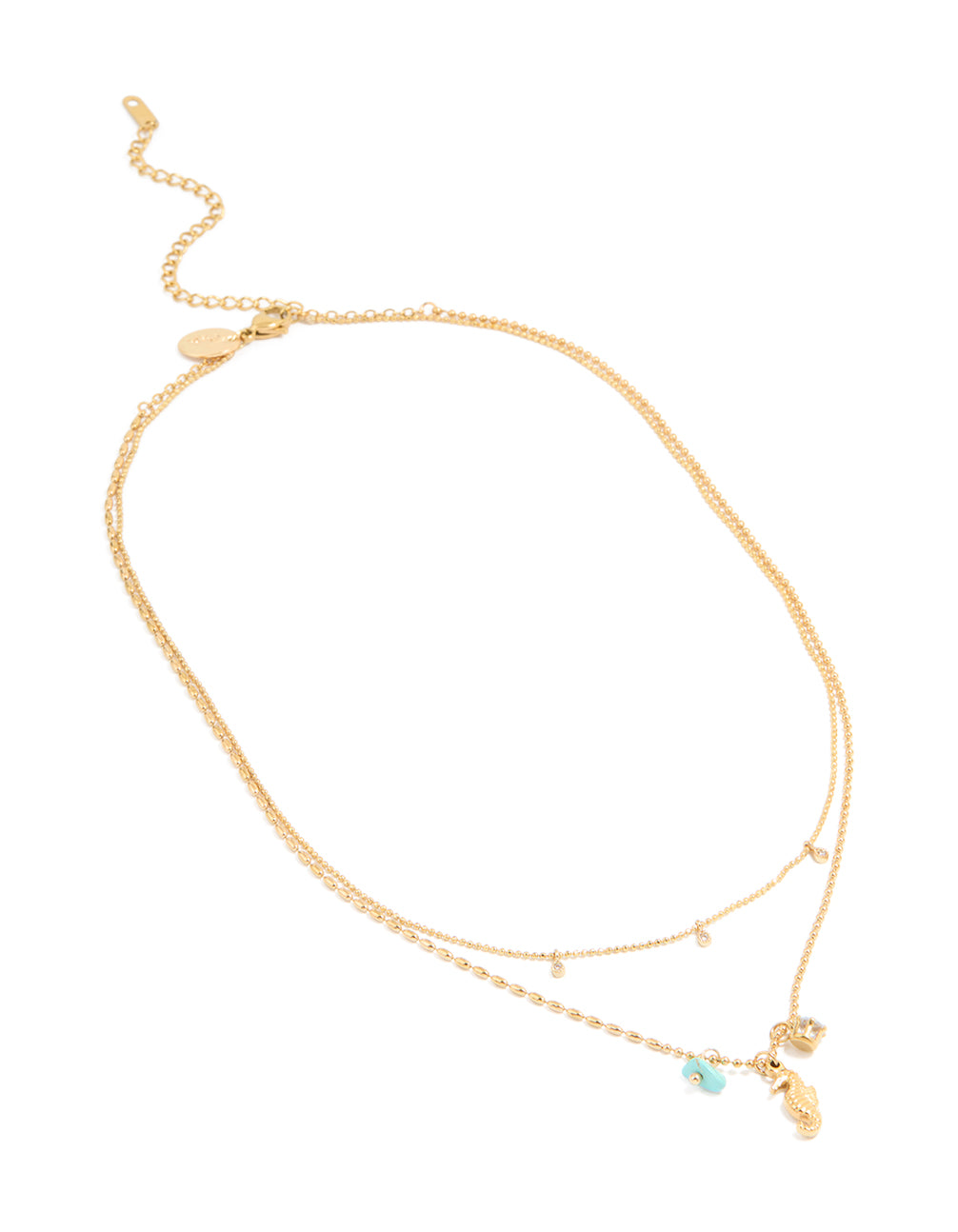 Dive into effortless style with this Waterproof Gold Plated Stainless Steel Cubic Zirconia & Seahorse Layered Necklace! Crafted from durable stainless steel, this layered necklace is shower, swim, and sweat-proof, so it's perfect for beach days, brunches, or nights out. The delicate seahorse charm brings a playful touch, while sparkling cubic zirconia crystals add a hint of glamour. The gold plating gives it an elegant finish that pairs beautifully with anything from a breezy summer dress to your favourite casual top. This dainty layered necklace is your go-to accessory for adding charm and sparkle, whether you're exploring seaside towns or just catching up with friends. A stylish, waterproof jewellery piece you'll love to wear anytime, anywhere! It features one cubic zirconia droplet layer and one seahorse and turquoise charm layer.