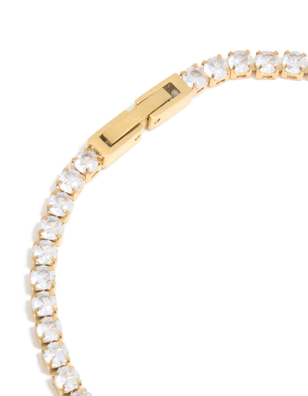 Elevate your everyday style with this Waterproof Gold Plated Stainless Steel Cubic Zirconia Tennis Bracelet. This chic piece of jewellery is designed with a classic tennis bracelet silhouette, featuring a stunning row of sparkling cubic zirconia crystals. Made from durable stainless steel and coated in a luxurious gold plating, this bracelet blends elegance and practicality. This charming tennis bracelet is waterproof—perfect for wearing while swimming, showering, or even during a workout. Whether you’re dressing up for a special occasion or adding a touch of glamour to a casual outfit, this bracelet has you covered. Pair it with a sleek evening dress for a sophisticated look or layer it with other bracelets for a trendy, everyday style.