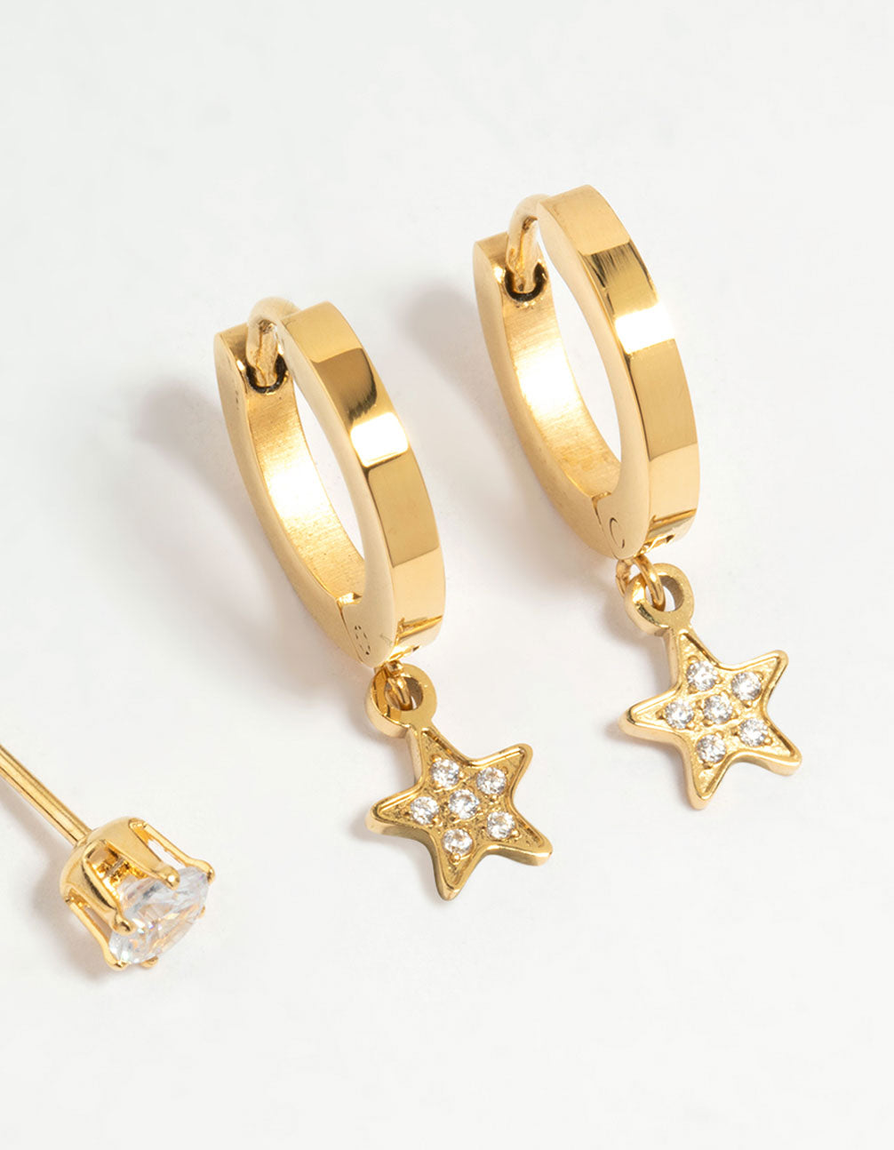 Waterproof Gold Plated Stainless Steel Diamante Star & Heart Stud Earrings 3-Pack