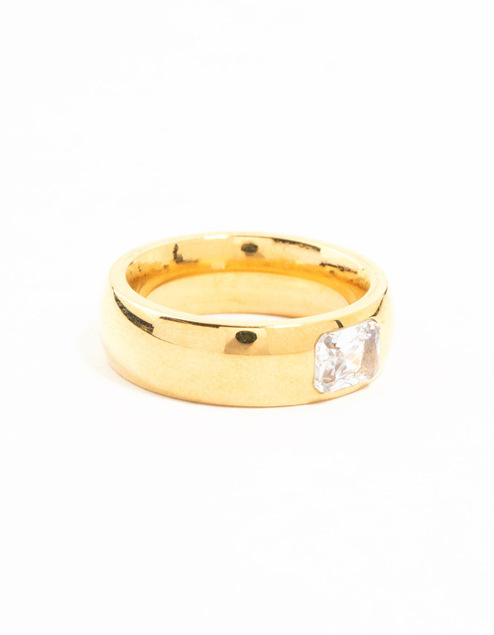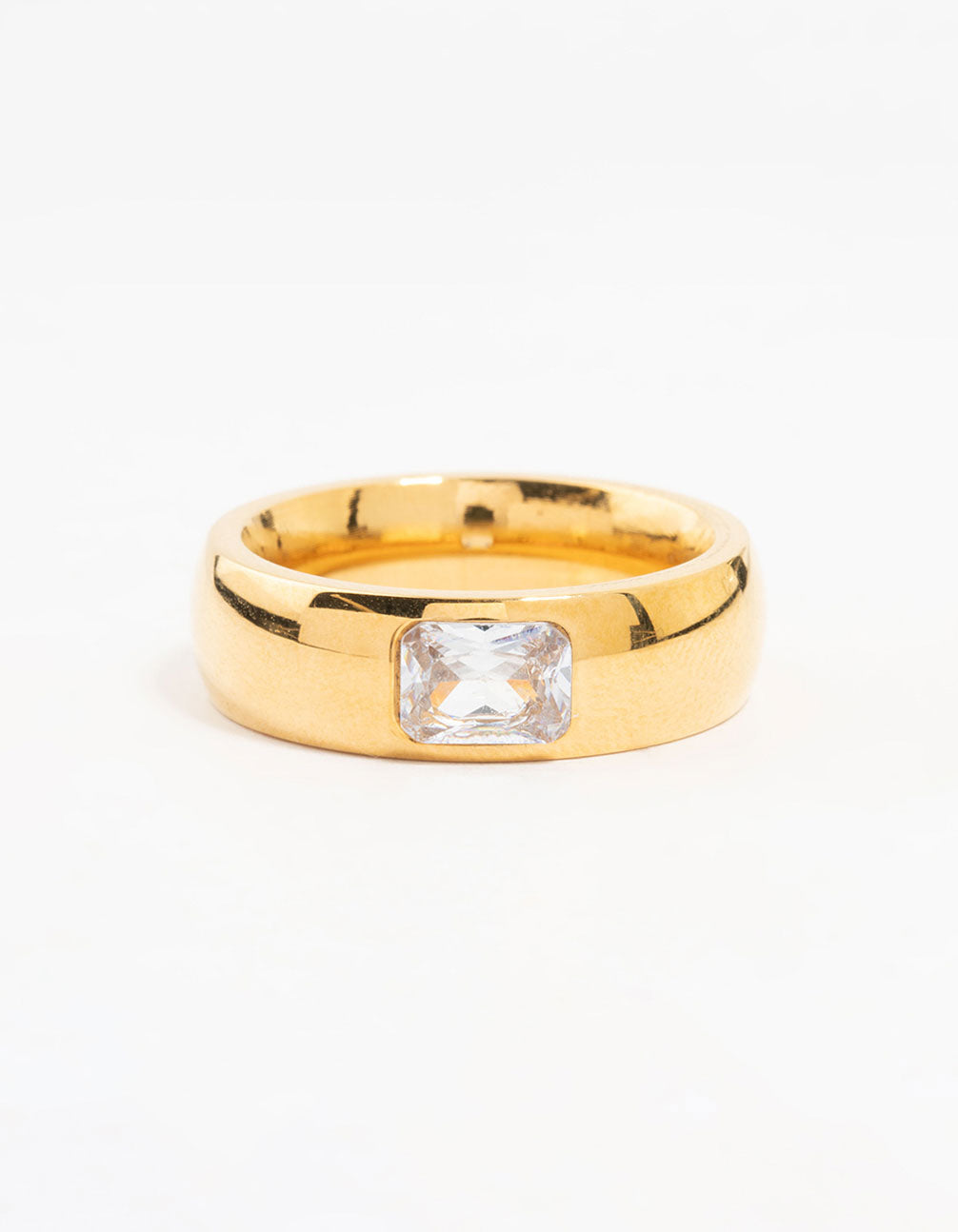 Waterproof Gold Plated Stainless Steel Wide Band Cubic Zirconia Ring