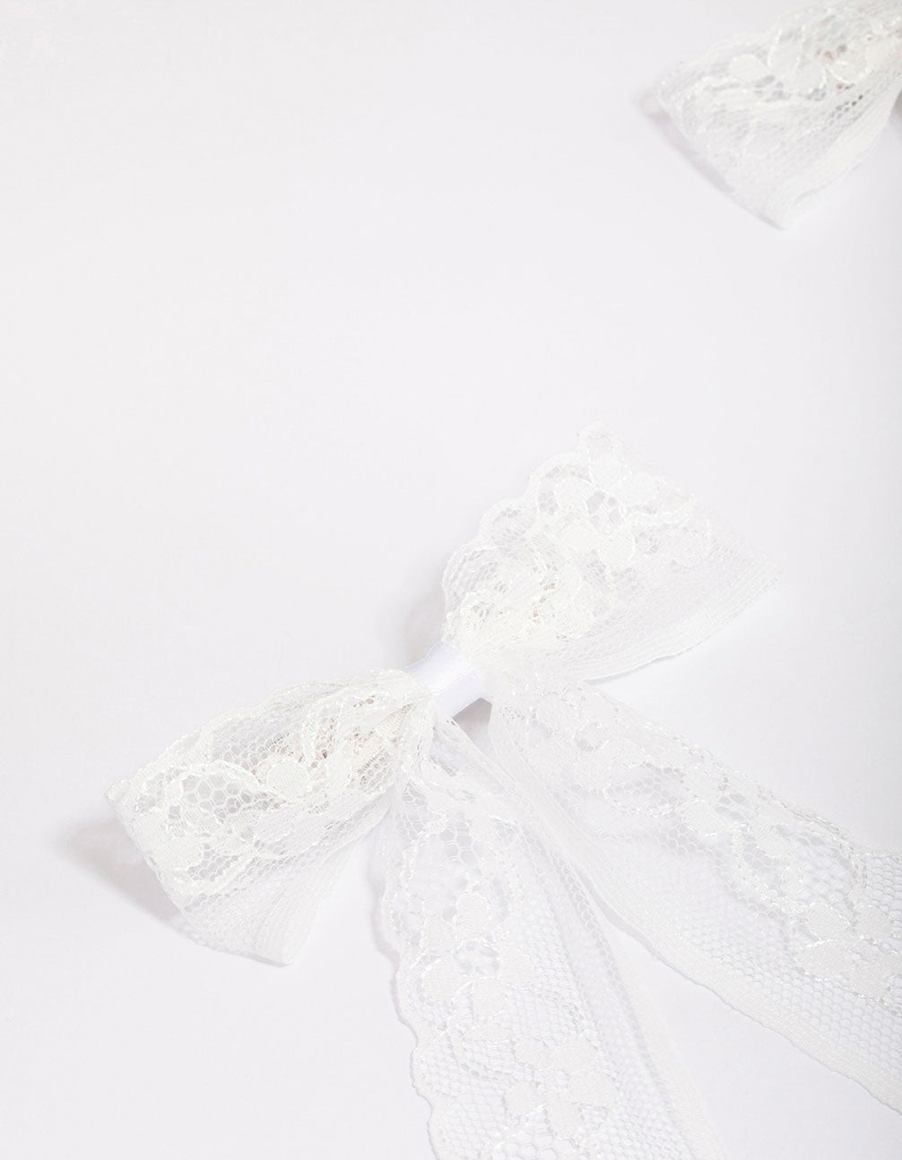 This hair accessory pack contains two, white lace hair bows designed with an aligator-style clip on the back.