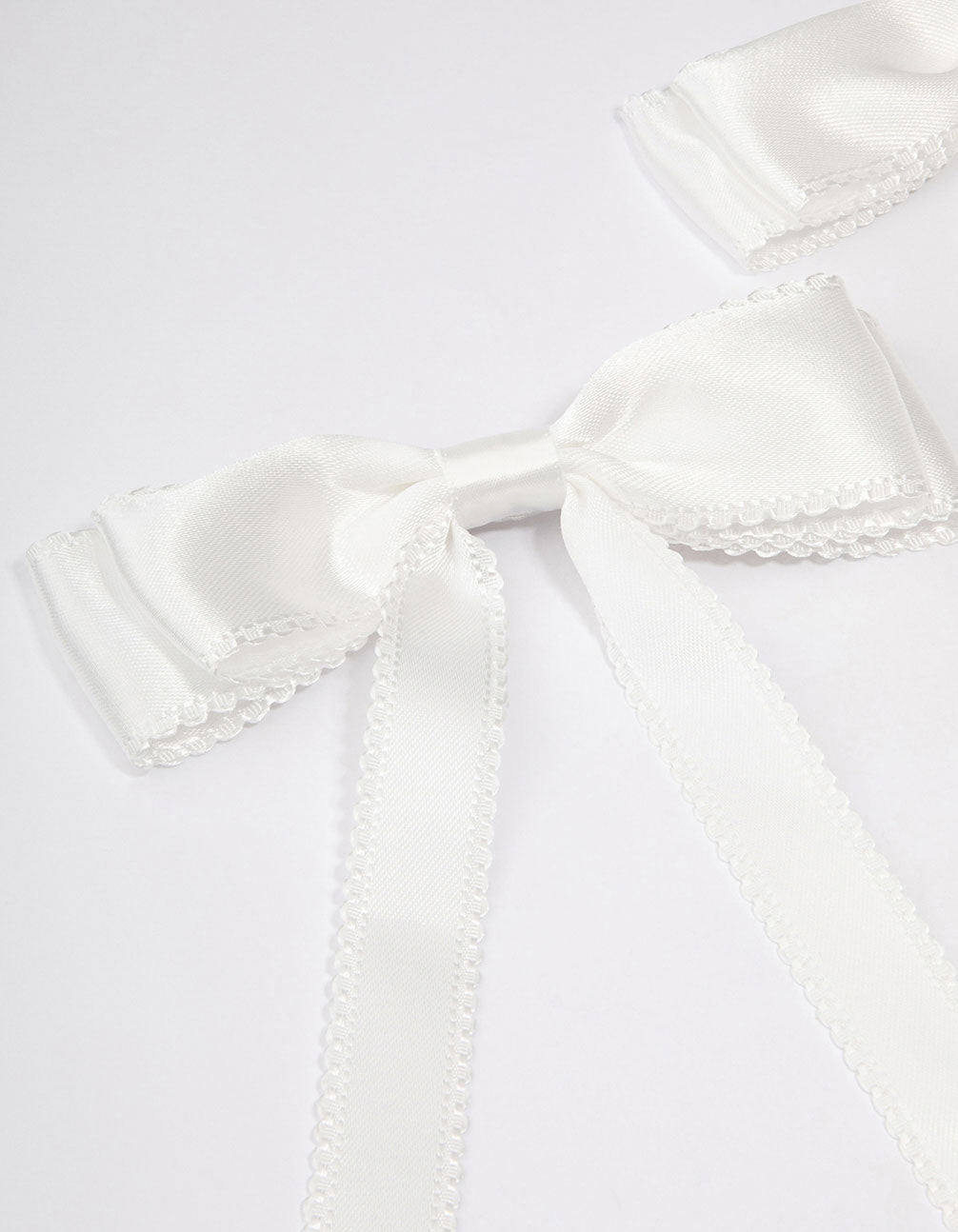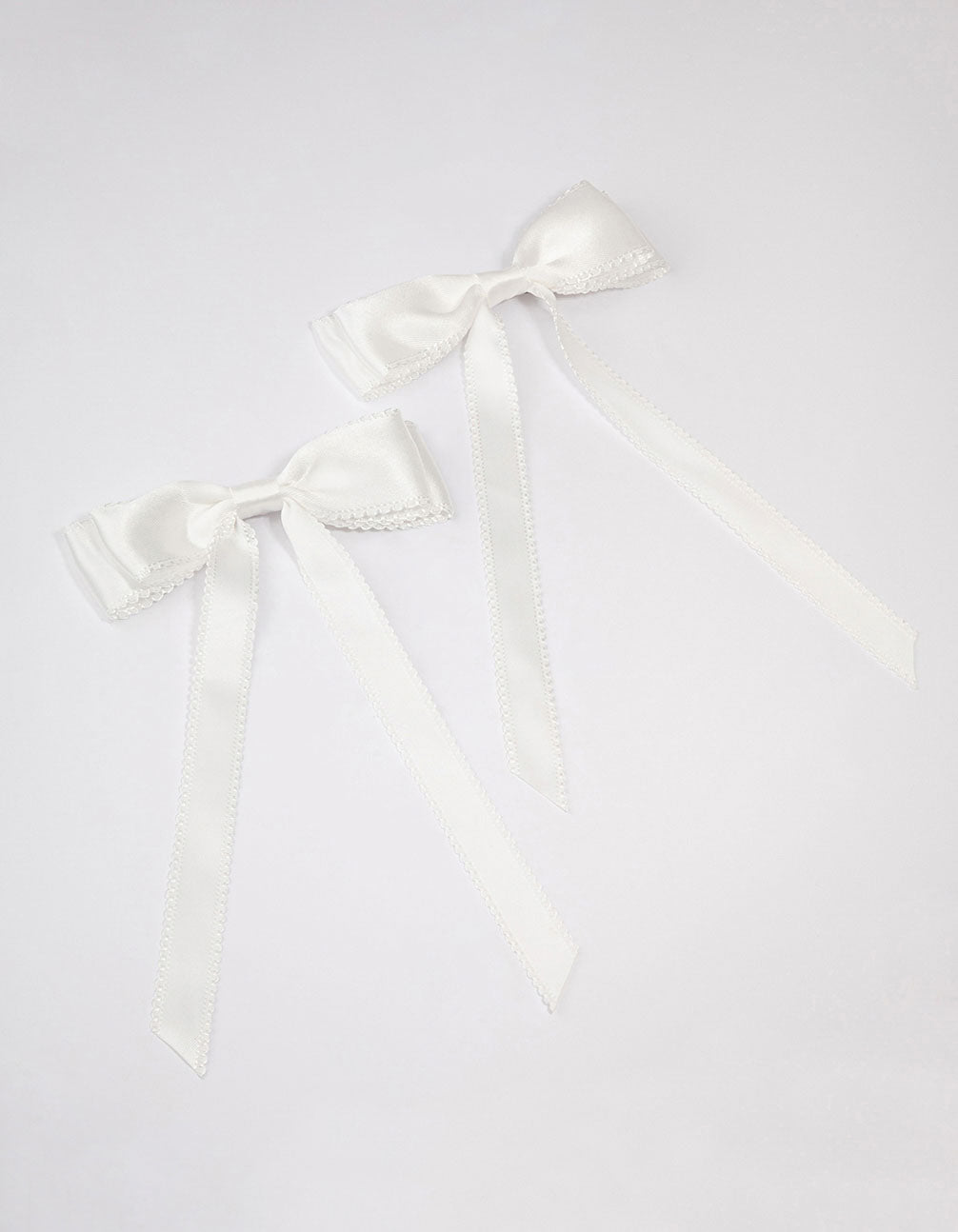 Style the coquette trend with this set of white hair bows. This hair accessory pack includes two individual ribbons, designed with a white satin fabric and alligator clip on the back.