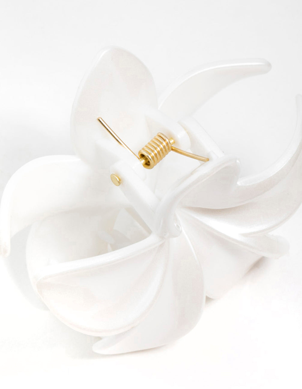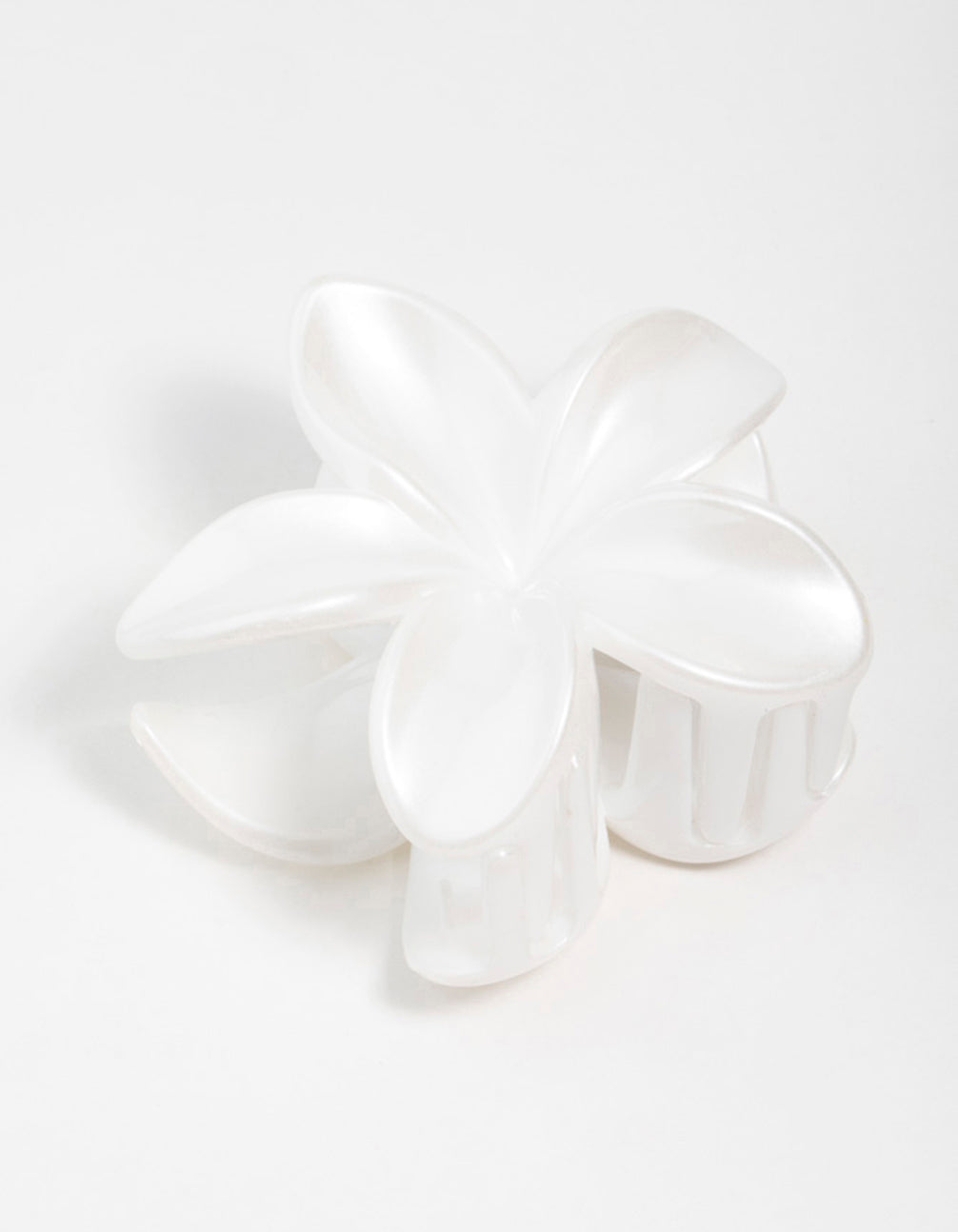 Add tropical charm with this White Frangipani Flower Claw Clip. Perfect for keeping your hair in place while adding a playful vibe, this claw clip is shaped like a delicate frangipani flower. Ideal for sunny days, beach outings, or casual brunches.